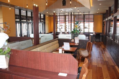 店内はウッド調のナチュラルモダンで明るい落ち着いた雰囲気。